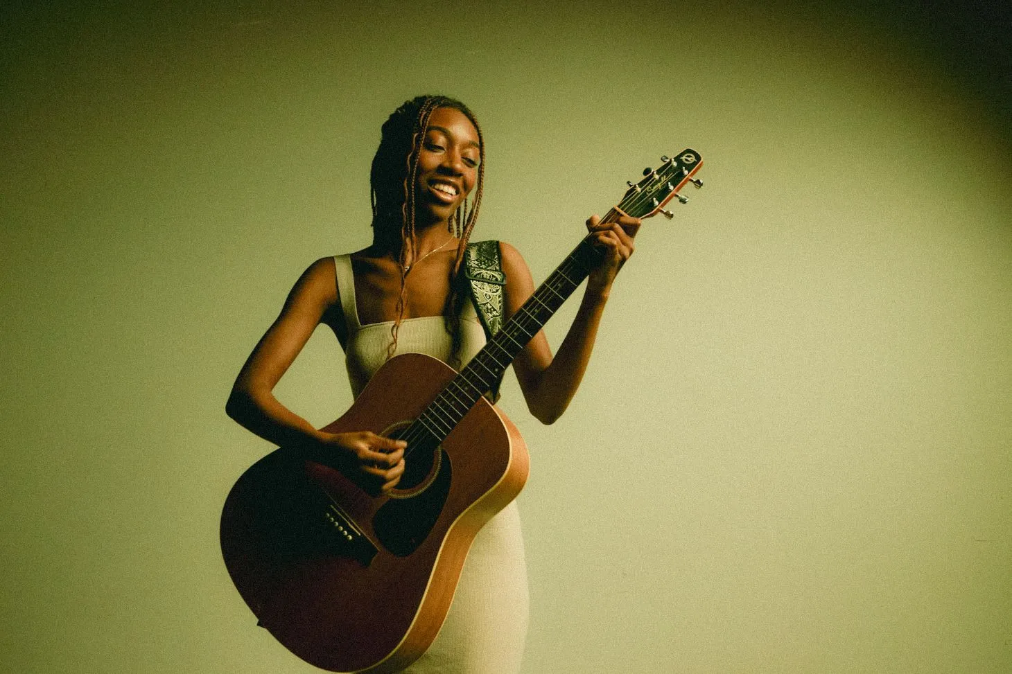 Bukola sitting and posing with a guitar.